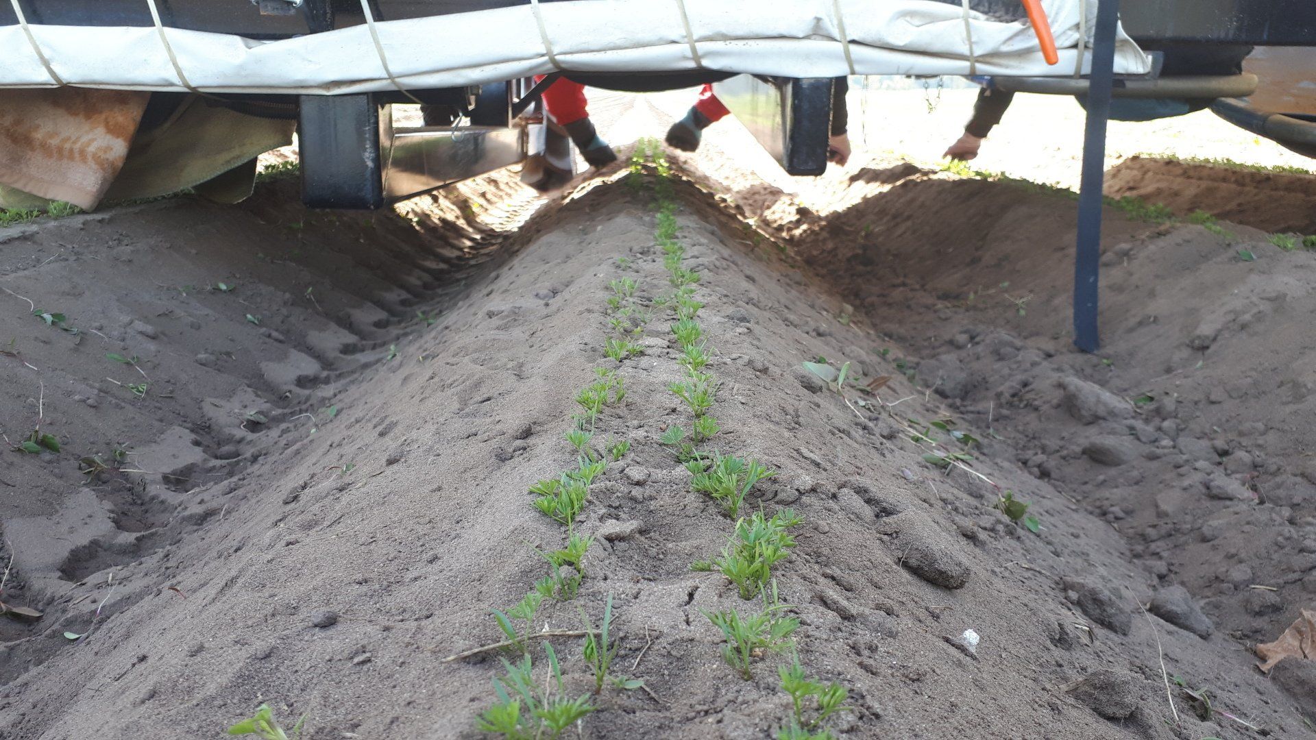 Die wichtigsten Erntemaschinen sind unser Kartoffelroder (ein einreihiger Bunkerrroder, der auch für die Zwiebeln genutzt wird ) und der Möhrenroder: ein Klemmbandroder mit Überlader.
