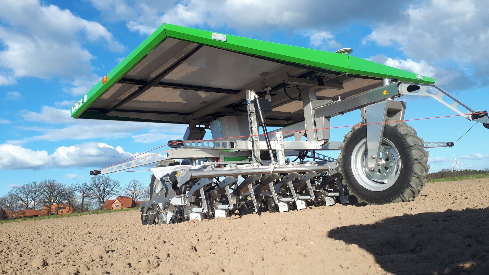 Während der Jätesaison fahren zwei Solar-betriebene Jäteflieger langsam über unsere Möhren- und Zwiebelfelder. Jeweils 8 Saisonkräfte ziehen dort von Hand und im Liegen ( also rückenschonend ), über Wochen hinweg, nicht erwünschte Wildkräuter aus den Reihen, die andernfalls mit den Kulturen um Licht, Boden und Wasser konkurrieren würden.