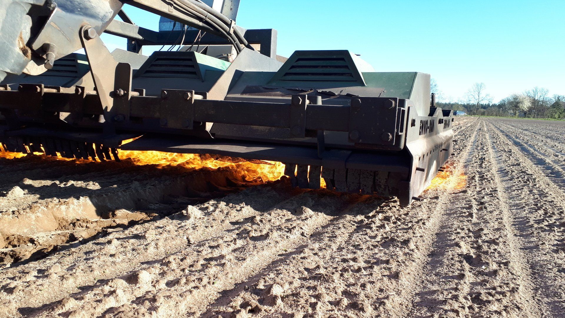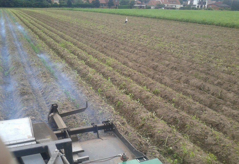 Kurz vorm Erscheinen der Keimblätter wird das bis dahin gewachsene Unkraut mit dem Abflammgerät beseitigt. Es wird nicht verbrannt, sondern nur soweit erhitzt, das die Zellen der Pflanze zerstört werden. Je nach Witterung liegen zwischen Aussaat und Aufgang 10 bis 30 Tage. Ein regelmäßiges genaues Kontrollieren ist hier nötig, da ein verpasster Abflammtermin erheblich mehr Handarbeit zur Folge hat. Manchmal macht trotzdem ein kräftiger Regen diese Strategie zunichte und es kann nicht geflammt werden.