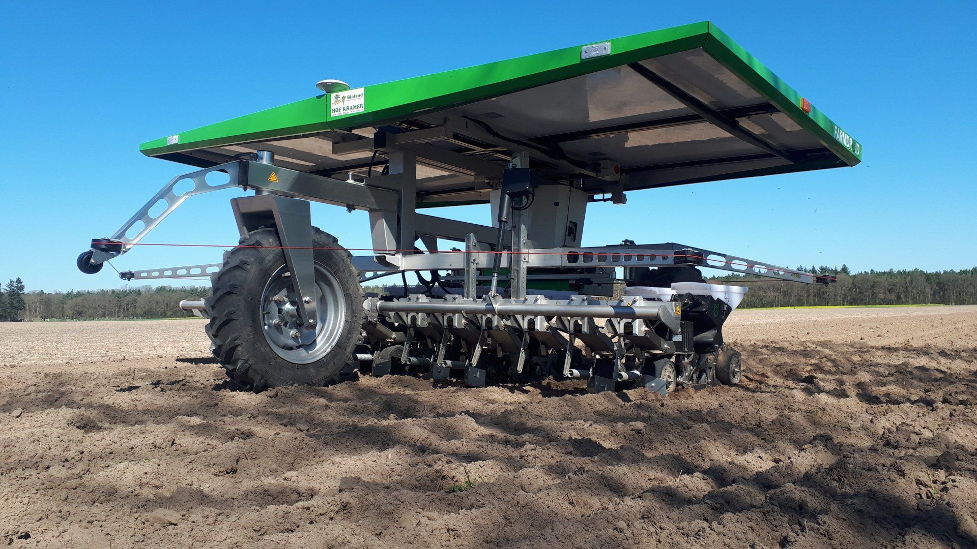 Die Zwiebeln werden vom solar-betriebenen Farmdroid-Roboter im Horst gedrillt. Der Roboter `merkt` sich per GPS die Ablagestellen der Samen und kann später in den Zwischenräumen gezielt das Unkraut hacken.